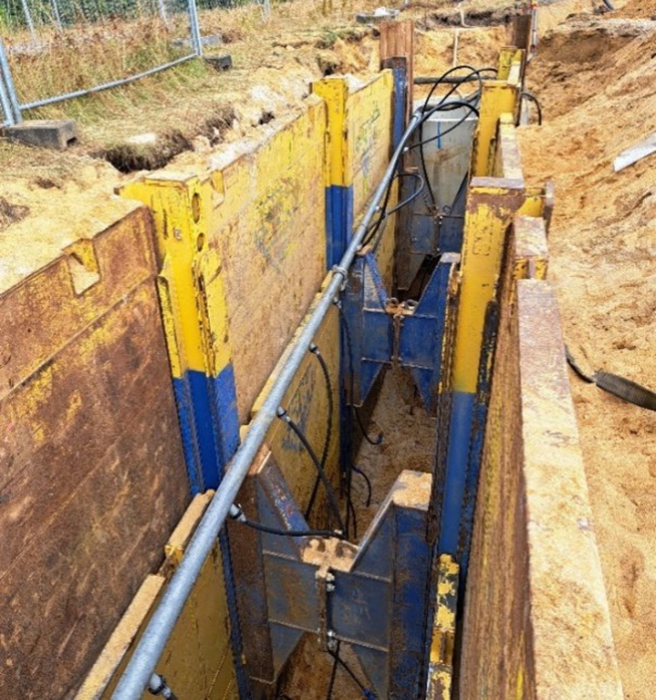 Eine besondere Herausforderung stellte die Umlegung einer öffentlichen Schmutzwasserleitung dar. Aufgrund des anstehenden Grundwassers, der Tiefenlage von rund 7,5 Meter und nahegelegener zu schützender Bäume wurde für die Umlegung die Herstellung des neuen Kanals in geschlossener Bauweise mit Pilotrohrvortrieb gewählt. SBI erstellte hierfür die Ausschreibungsunterlagen und begleitete die Maßnahme in der Bauüberwachung. Während der Bauausführung kam es zu einem Hindernis in der geplanten Trasse, weswegen Teile der Umlegung in offener Bauweise verlegt werden mussten. Dafür wurden Baugruben von rund sieben Metern mit einem Gleitschienenverbau hergestellt.